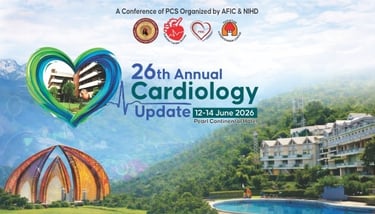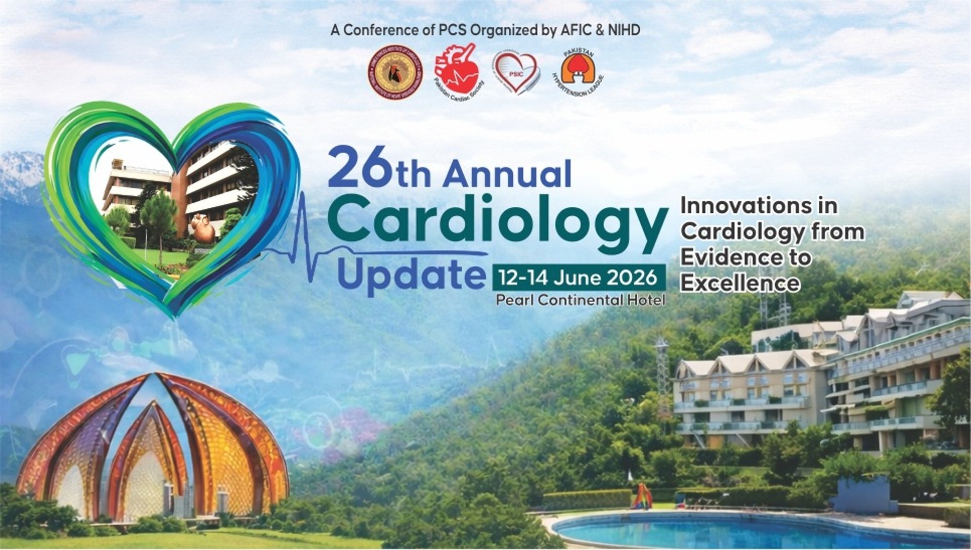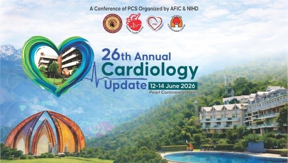IWe are pleased to invite you to participate in the 26th Annual Cardiology Update, scheduled 12th to 14th June 2026, in Pearl Continental Hotel, Bhurban. The conference is being organized by AFIC & NIHD, Rawalpindi on behalf of Pakistan Cardiac Society. The theme of the conference is “Innovations in Cardiology from Evidence to Excellence”.